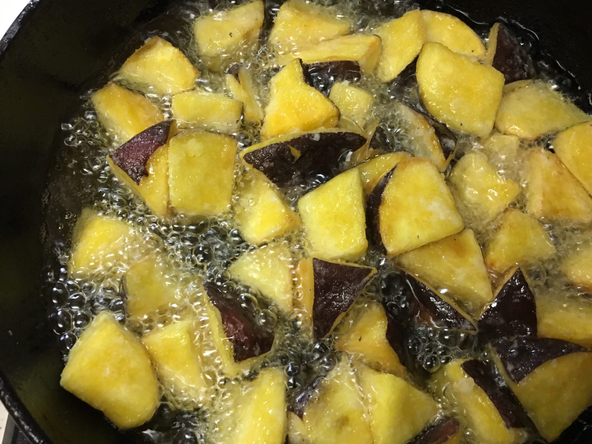 油を切って、芋が熱いうちにたれをからめたらできあがり。
