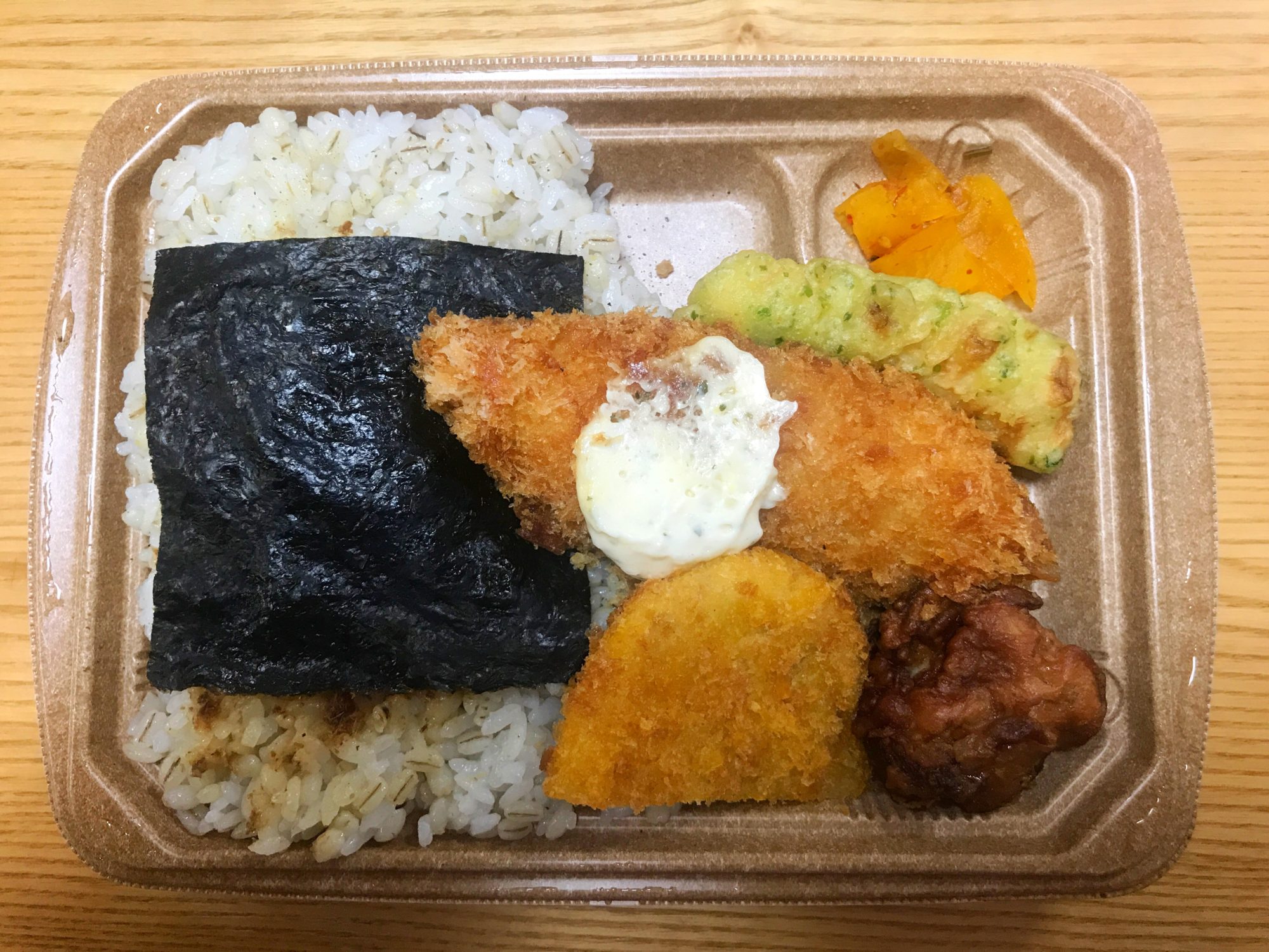 昔のセブンイレブンの海苔弁は普通の白いご飯だったはずなのですが、商品改定で麦飯化しました。健康志向の高まりを受けての変更かな?